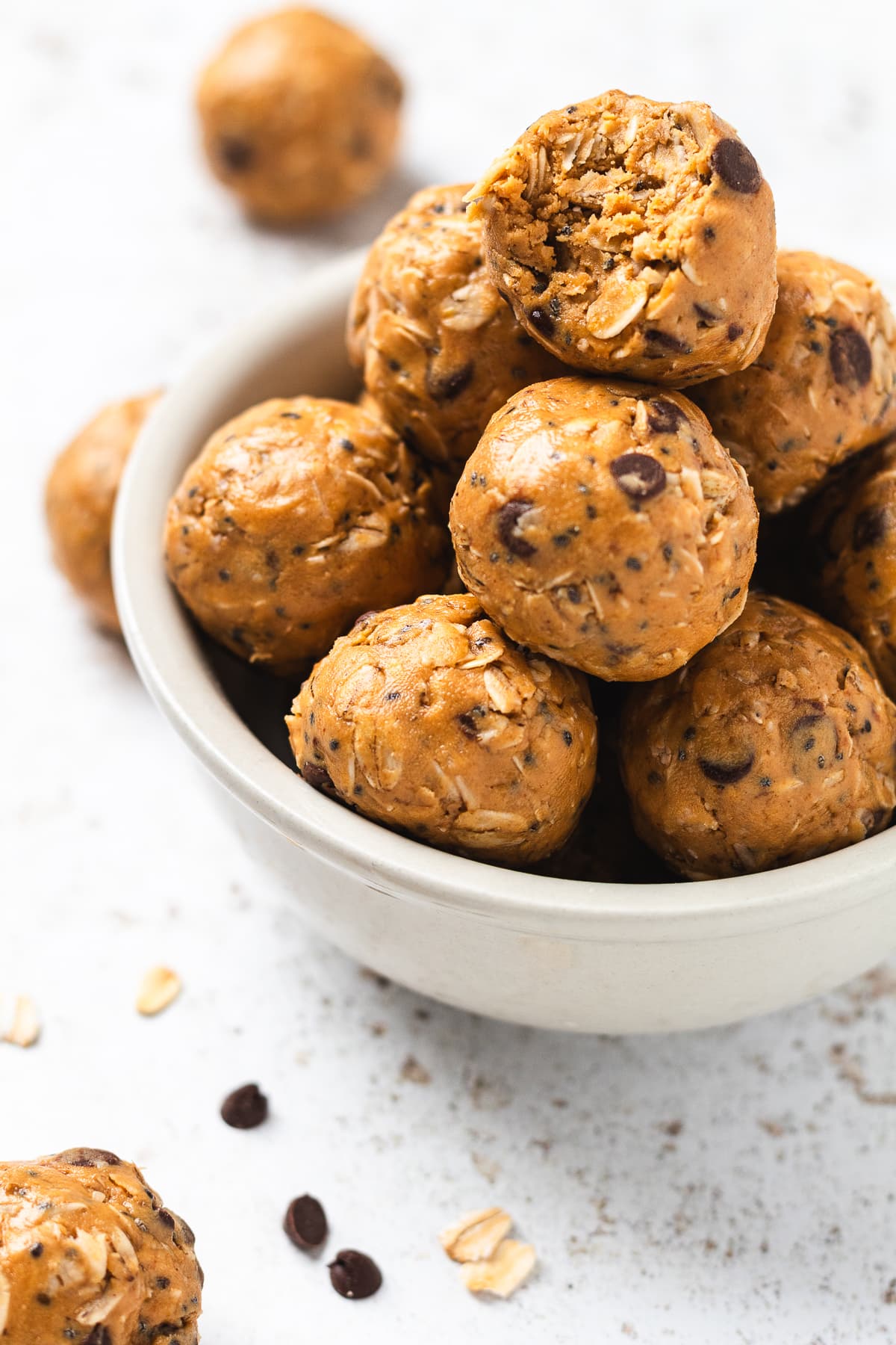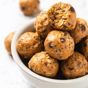Our No-Bake Protein Balls are fast, easy, inexpensive, delicious, and made with simple ingredients. We keep them in our snack rotation because they taste like a chocolate chip cookie combined with energy-sustaining ingredients like oats and peanut butter. Yummy, yummy!